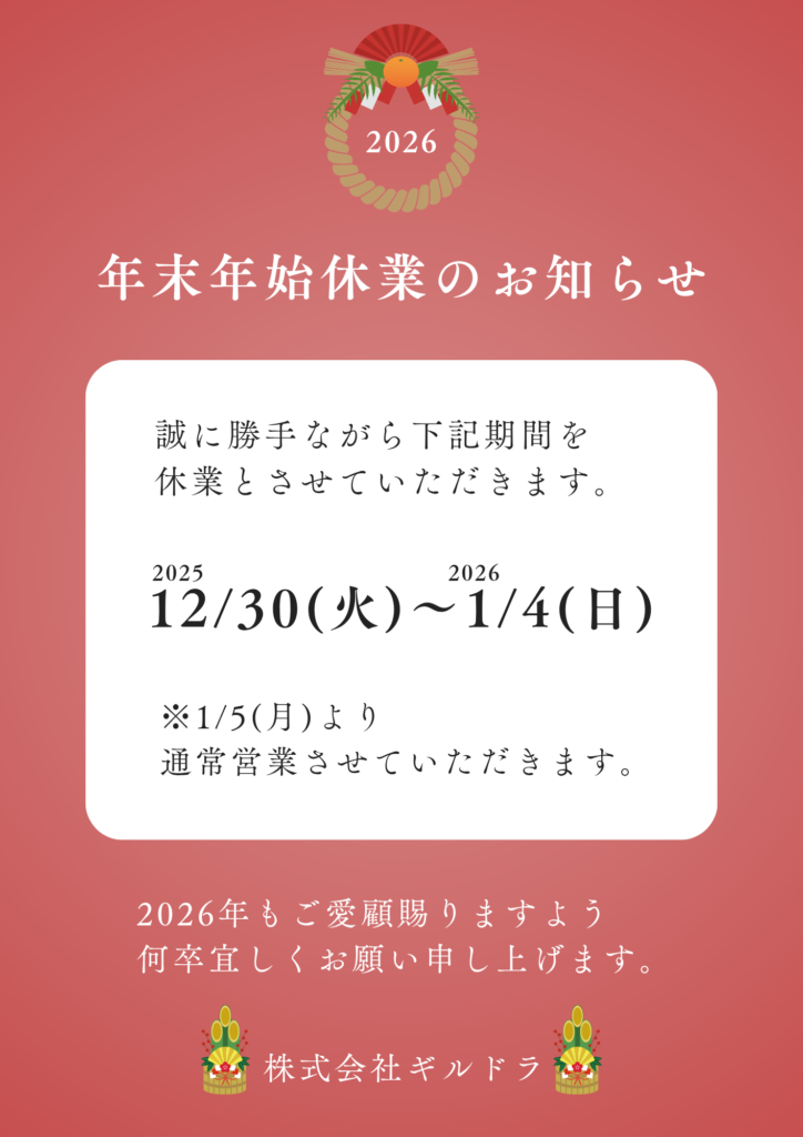 年末年始休業のお知らせ 2025 12/25 お知らせ 2025年12月25日 お知らせ ☆ギルドラクリームBs【1個増量】キャンペーン☆12/22〜 1月 月暦 関連記事 ☆ギルドラクリームBs【1個増量】キャンペーン☆12/22〜 2025年12月22日 【会員限定】LINE注文が可能となりました! 2025年10月1日 ☆ゼロバランスギルドラクリームプレゼントキャンペーン☆9/16〜 2025年9月16日 9月 月暦 2025年9月1日 夏季休業のお知らせ 2025年8月12日 8月 月暦 2025年8月1日 ☆ゼロバランススプレープレゼントキャンペーン☆7/14〜 2025年7月14日 🎁水晶ストラッププレゼントキャンペーン🎁5/15〜 2025年5月15日